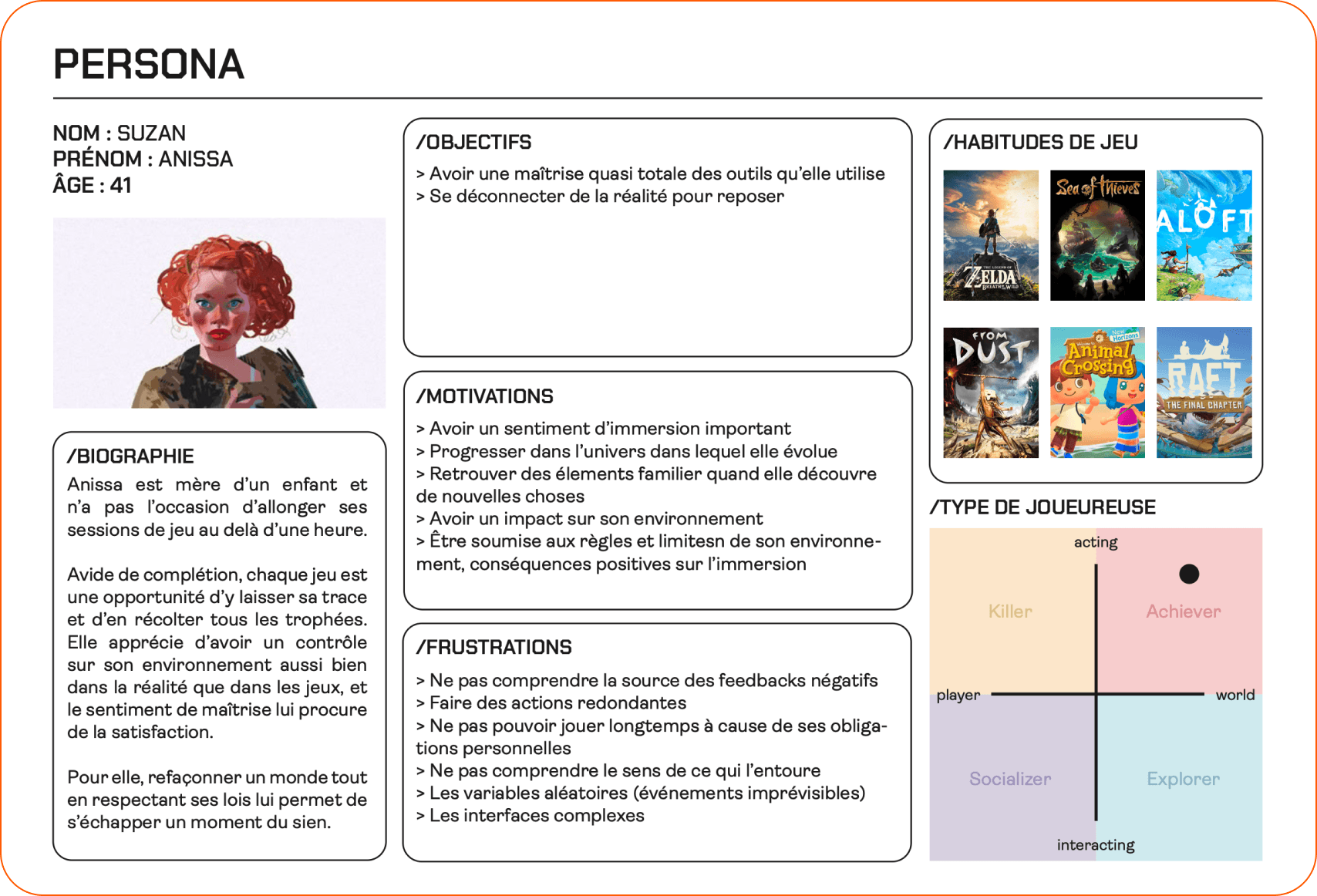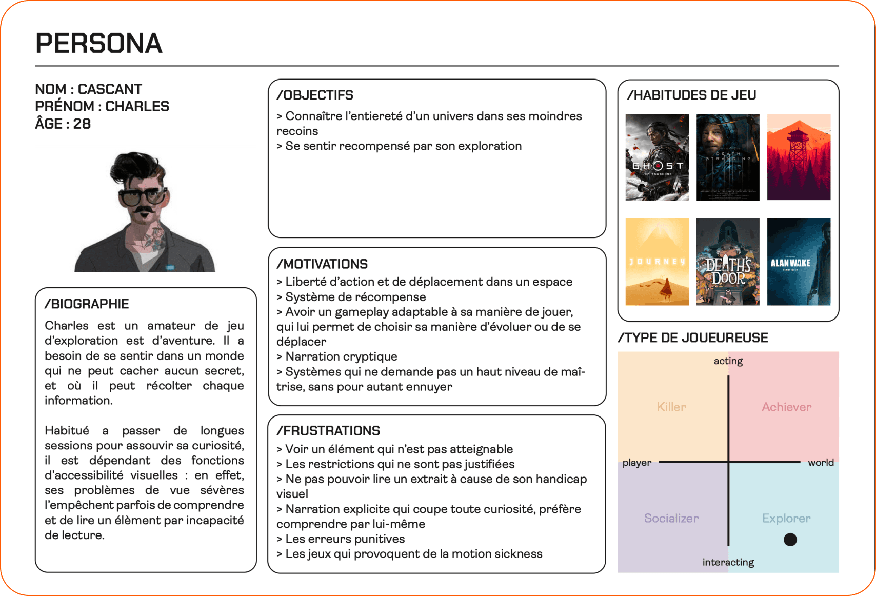 To give a better understanding of our audience to the team, personas have been made. To build two different types of players, I analysed steam games similar to Fading Echoes, more precisely their comments : what comes out of positive and negative ? With these data, we were able to determine typical players and their expectations.