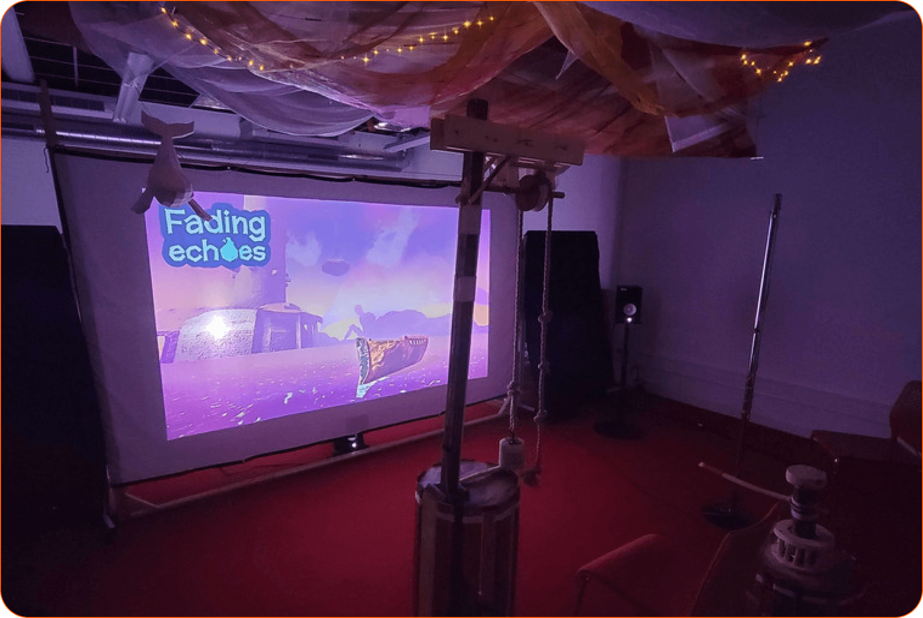 Fading Echoes is an exploration game and an immersive installation, inviting you to sail a boat through a strange, dreamlike sea by physically manipulating ropes and a helm. You take on the role of an unnamed castaway, left stranded on a water disk where old memories seem to have taken physical shape.